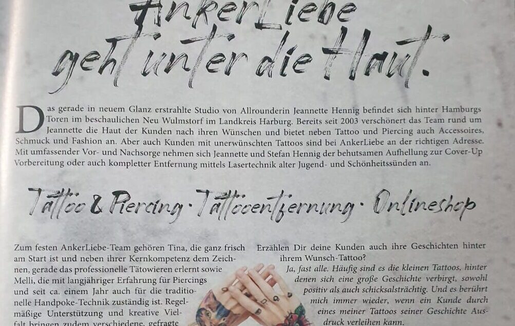 In Zusammenarbeit mit den Verlagskontor Schönes Leben ging die Inhaberin und Geschäftsführerin Jeannette Hennig in’s Gespräch. In einem Interview wurde über das Tätowieren als Beruf gesprochen und die Leidenschaft für kreative Berufe. Aber auch über Vorurteile und schwierige Entscheidungen wird gesprochen. Weiteren Informationen findet man im Bericht.